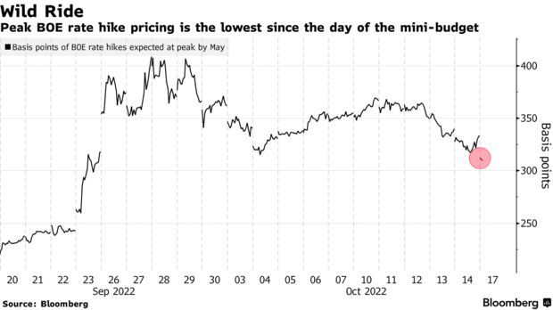 此外,交易员也减少了英国央行加息的押注,因为财政刺激方案的缩减减轻了英国央行收紧货币政策压力。货币市场显示,英国的利率将在2023年达到5.3%的峰值,这是自9月23日英国政府公布“迷你预算”以来的最低水平;对利率最敏感的两年期英国国债收益率下降了28个基点,至3.64%。