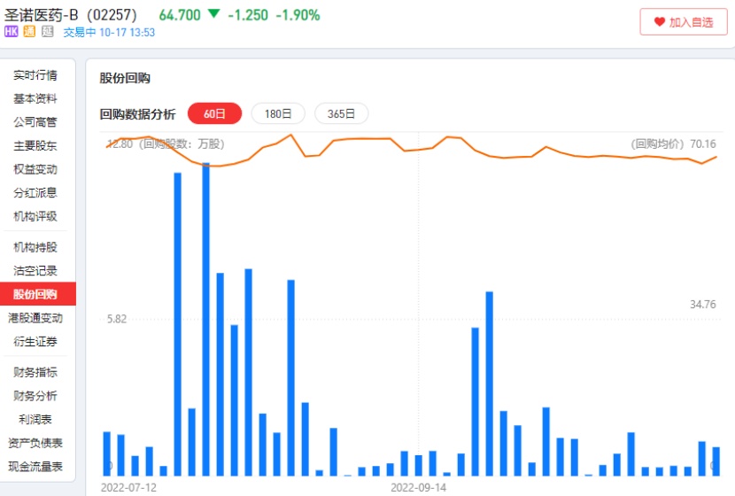 智通财经APP统计到,自7月12日至10月14日,圣诺医药在3个月时间内累计回购44笔,累计回购股数达101.51万股。其中,7月21日,公司回购了11.63万股,金额达到734.94万港元,为区间范围内回购量最大的一笔。
