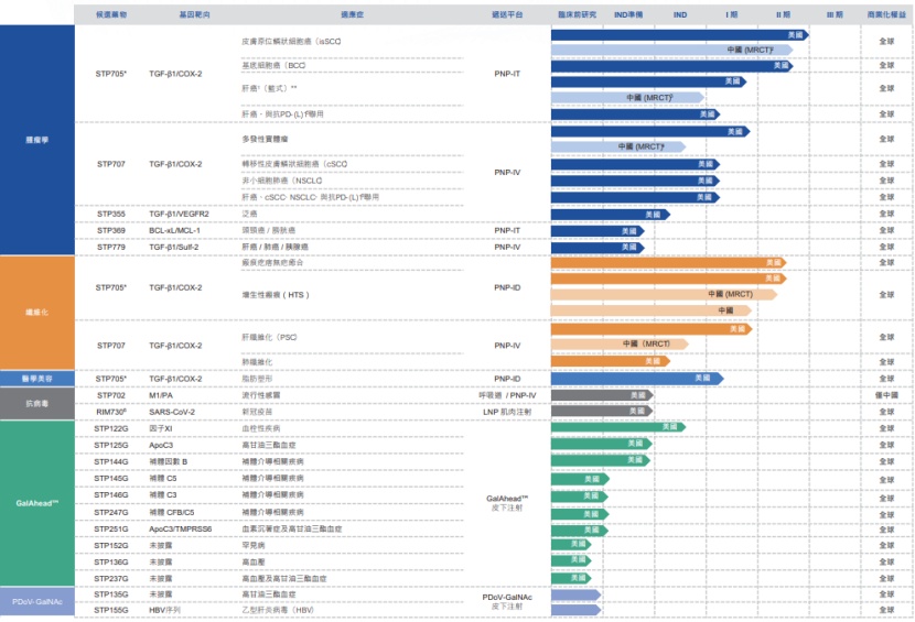 据智通财经APP了解,目前公司管线包含十多种处于临床前及临床阶段候选产品,适应症覆盖肿瘤学、纤维化、医美、抗病毒物质及GalNAc-RNAi触发器几大领域。