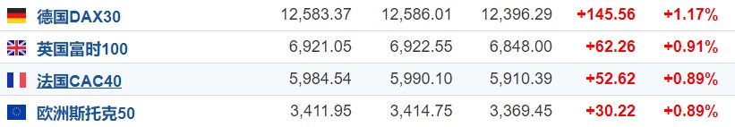 2. 截至发稿,德国DAX指数涨1.17%,英国富时100指数涨0.91%,法国CAC40指数涨0.89%,欧洲斯托克50指数涨0.89%。