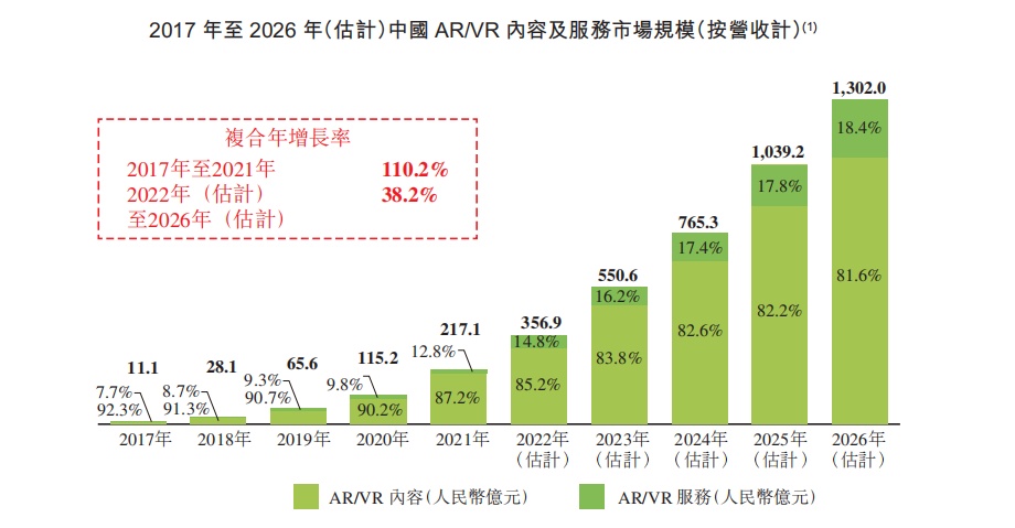 据悉,AR/VR内容及服务属于元宇宙生态系统的场景应用层,主要为用户提供沉浸式虚拟世界体验的各种场景及应用程序。近年来,随着AR/VR技术逐渐在各类应用场景落地,国内AR/VR内容及服务高速发展——按收入计,AR/VR内容及服务市场的市场规模已经从2017年的11亿元增长至2021年的217亿元,复合年增长率达110.2%,至2026年达1302亿元。