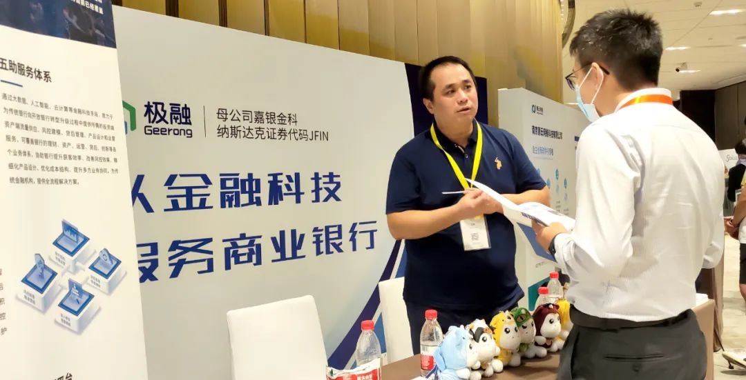 会议现场,在极融展台,嘉宾们纷纷前来咨询业务,极融现场工作人员为来宾作了详细解答。