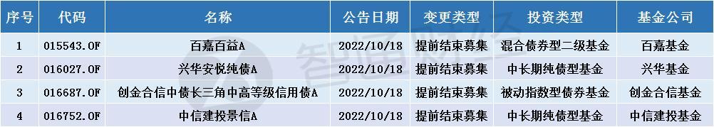 智通财经APP获悉,10月18日,百嘉基金、兴华基金、创金合信基金、中信建投基金等四家基金公司发布公告称,公司旗下的新基金提前结束募集,从基金类型看,这4只基金均为债券型基金。