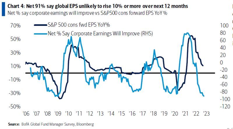 以Michael Hartnett为首的美银策略师周二在一份报告中表示,美银的月度全球基金经理调查“显示出宏观投降、投资者投降、政策开始投降的迹象”。他们预计,在美联储最终停止加息后,美国股市将在2023年上半年触底。