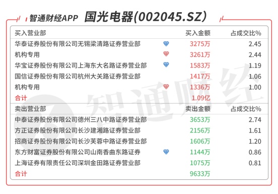 国光电器(002045.SZ):龙虎榜阵容豪华,机构席位对倒净买入3700万元,买一是知名游资的席位买入3272万元,买三是知名游资的席位买入1577万元,当日净买入513万元,该股如突破近期平台,需持续放量。
