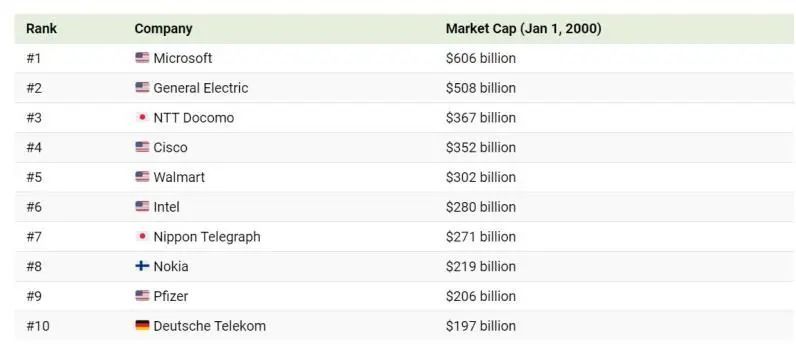 2000年,微软是全球上市公司中的市值最高的公司。当年,投资者纷纷向与互联网相关的科技初创公司注资。随着个人电脑和互联网的普及,投资者希望在这些公司开始真正盈利之前“尽早进入”。这种过分热情的情绪反映在当时上市公司的市场资本化上,尤其是那些被视为受益于互联网繁荣的科技或电信公司。