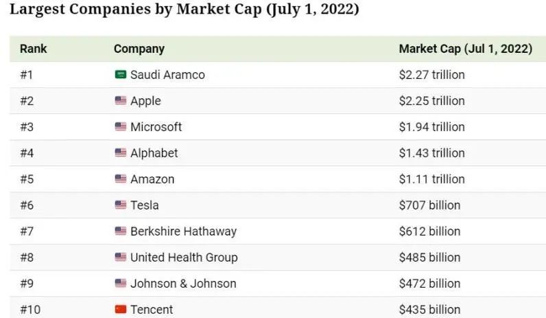 截至2022年7月,全球最大的10家上市公司的总市值接近12万亿美元,但榜单上的TOP 10