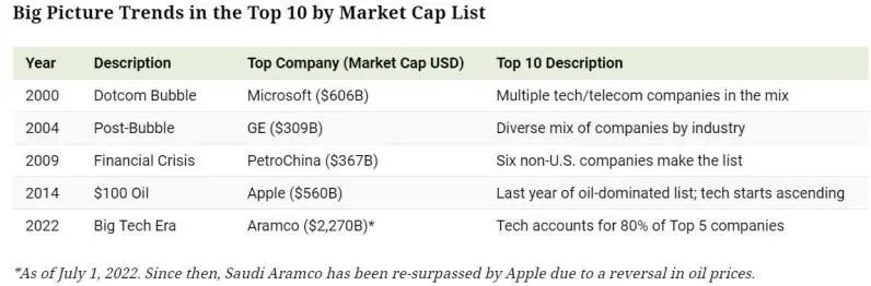 然后在2010年前几年,埃克森美孚、中石油、俄罗斯天然气工业股份公司和英国石油公司等能源公司霸榜,因为油价飙升超过每桶100美元。到2022年,随着大科技再次成为人们关注的焦点,至此,科技到能源再回到科技,全球最高市值榜已经完成了一个完整的循环。