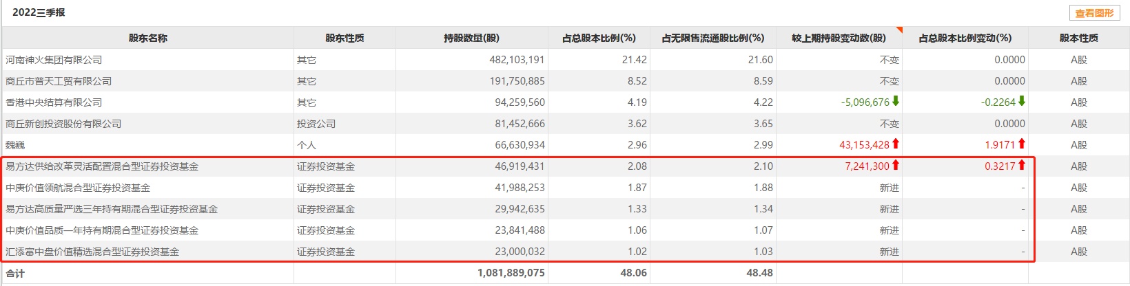 具体来说,丘栋荣管理的中庚价值领航混合和中庚价值品质一年持有期混合分别持有4198.83万股、2384.15万股,较二季度末持有的56.5957万股、65.59万股,环比增加逾73倍、35倍,即三季度,丘栋荣增持神火股份近6460.79万股。