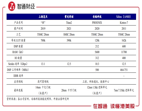上海复旦的 FPGA产品具有明显的行业优势,2018年发布的新一代拥有完全自主知识产权的亿门级FPGA产品,是国内首家推出超大规模亿门级FPGA产品,而且产品技术不断迭代,目前其14nm十亿门级FPGA芯片预计于2022 年底完成流片,2023-2024 年有望进入量产阶段。此外,该公司也是唯一的国产28nm PSoC供应商,产品应用于工业视觉及智能监控领域。
