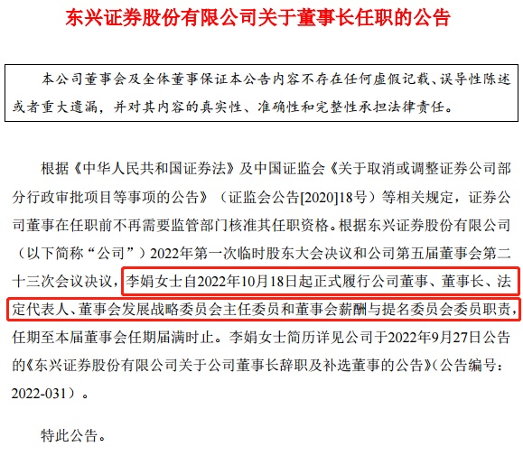 智通财经APP获悉,10月19日,东兴证券(601198.SH)董事长任职事项“尘埃落定”。其2022年第一次临时股东大会决议和公司第五届董事会第二十三次会议决议显示,李娟女士自2022年10月18日起正式履行公司董事、董事长、法定代表人、董事会发展战略委员会主任委员和董事会薪酬与提名委员会委员职责。