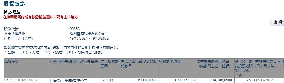 智通财经APP获悉,香港联交所最新资料显示,10月17日,上海张江(集团)有限公司减持微创医疗(00853)600万股,每股作价16.9388港元,总金额约为1.02亿港元。减持后最新持股数目约为2.15亿股,最新持股比例为11.76%。