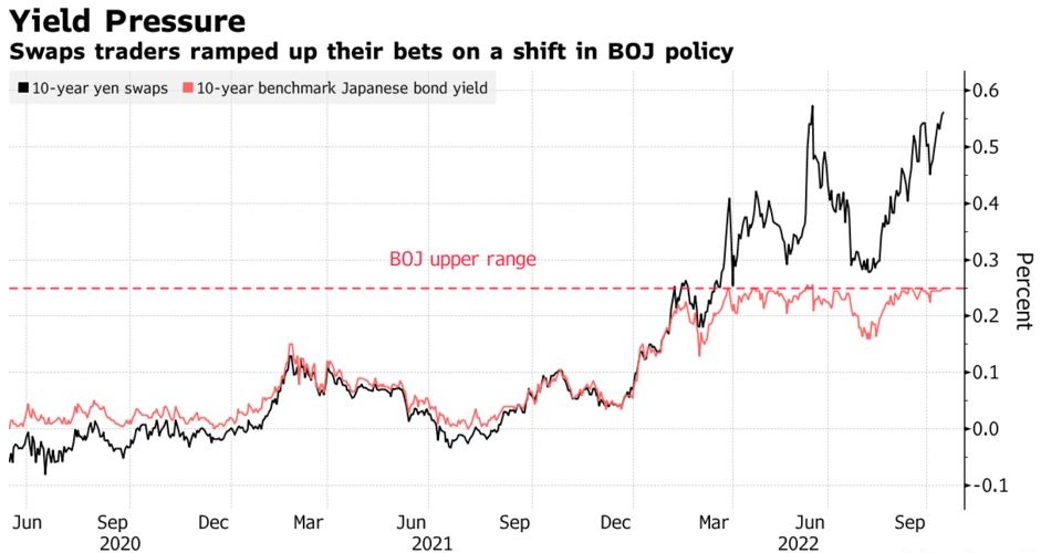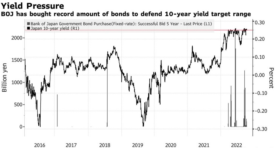 日本央行的超宽松政策已将日元汇率推至1990年以来的最低水平,尽管日本财务省为贬值进行了干预,交易员们关注的是日本和美国基准收益率之间不断扩大的差距。越来越多的人猜测,随着全球其他主要央行不断加息,人日元贬值最终将迫使日本央行让10年期日债收益率走高。