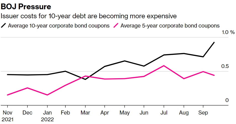 在日本信贷市场,投资者对较长期债券收益率飙升的风险要求更高的溢价。彭博汇编的数据显示,10月份发行的10年期公司债券的平均票面利率升至0.92%,高于4月份本财年开始时的0.57%。相比之下,5年期日本国债的平均利率同期小幅降至0.44%。