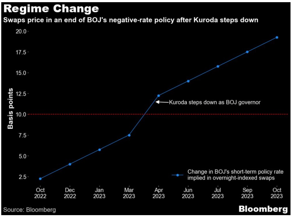 根据彭博社收集的数据,隔夜指数掉期已经充分反映出日本央行负利率政策将在黑田东彦明年4月份离任前后结束,这意味着日本央行将把短期政策利率从-0.1%上调10个基点。