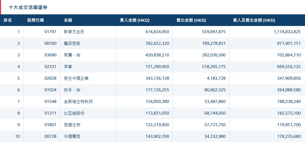 新东方在线(01797)获净买入5483万港元。消息面上,华泰证券发研报表示,公司商业模式兼具直播影响、电商平台、优质消费品品牌企业的特点,看好东方甄选内容的持续创新,在选品、运营、用户服务等环节逐步体系化地进行品牌建设,因此认为应具备一定估值溢价。该行维持“持有”评级,目标价上调至31.31港元。