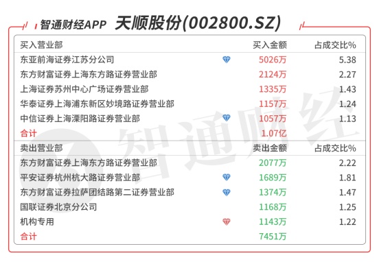 天顺股份(002800.SZ):多主力现身龙虎榜,机构与游资出现分歧,机构席位对倒卖出206万元,买一是知名游资的席位买入4708万元,买五是顶级游资孙哥的席位买入1053万元,当日净买入3798万元,该股今日连扳,强势特征明显。