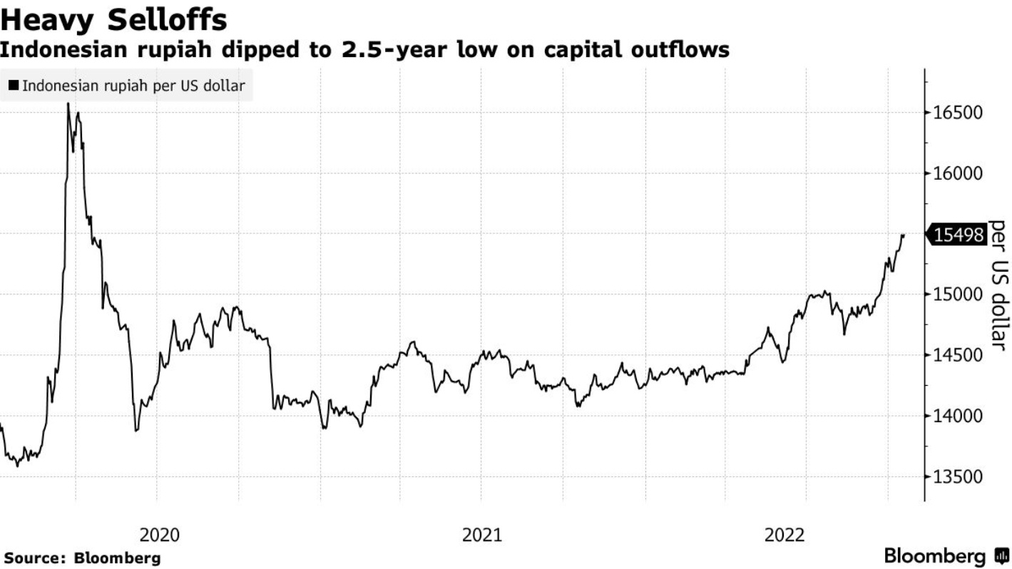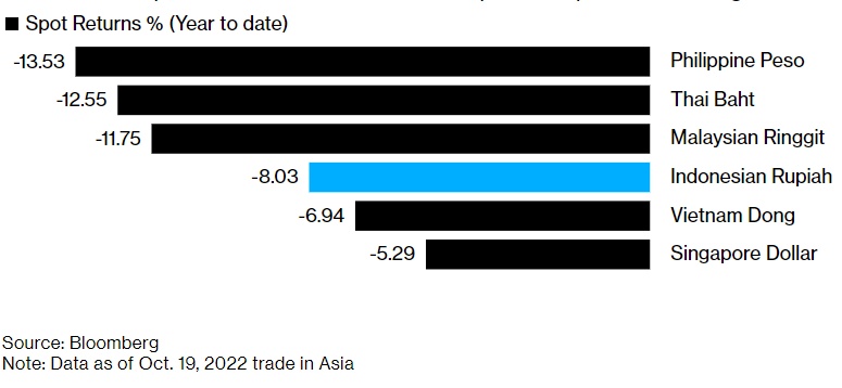 Warjiyo也试图缓和预期,称印尼不需要像其他国家那样激进,也不需要赶上美联储的步伐,因为通胀是可控的。事实上,印尼盾的表现相对好于大多数邻国,如与贬值幅度均超过10%的菲律宾比索、泰铢和马来西亚林吉特相比,印尼盾今年只贬值了8%。