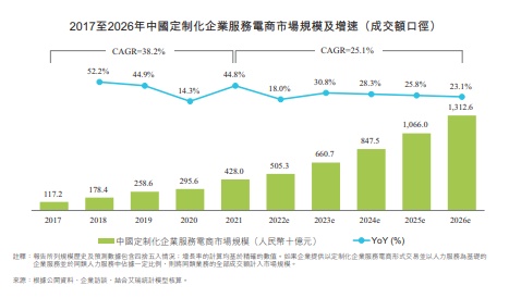 为了满足各市场行业的数字化需求,定制化企业服务电商市场快速增长。根据艾瑞咨询报告,2021年中国定制化企业服务电商市场规模已由2017年的1172亿元快速增长至2021年的4280亿元,复合增长率为38.2%,并预计到2026年该市场企业服务规模将进一步增长至1.31万亿元,复合增长率为25.1%。