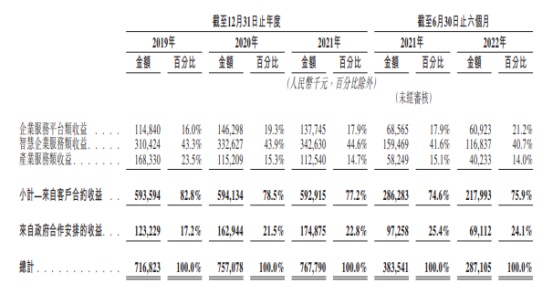 虽然公司的智慧企业服务业务推出的时间并不长,但却是公司的最主要收入来源。2019年、2020年、2021年及2022年上半年(下称“报告期”),来自此分部的收益占比分别为43.3%、43.9%、44.6%及40.7%,而企业服务平台业务的收入占比仅维持在20%左右。