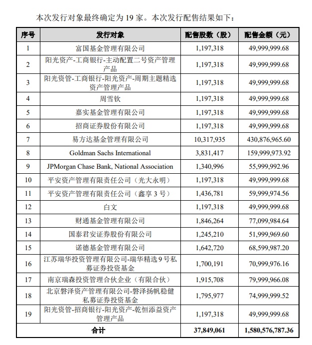 新雷能此次定增项目发行对象最终确定为19家,除富国外,嘉实、易方达、财通、诺德等公募,小摩、高盛,以及私募瑞华精选9号和磐泽扬帆稳健也参与认购。