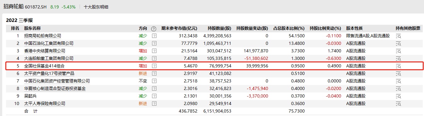 智通财经APP获悉,10月19日晚间,招商轮船(601872.SH)发布的三季报中,显示了前十大流通股东最新持股情况。值得注意的是,社保基金414组合大幅增持招商轮船,三季度增持近4000万股,环比二季度末持股数增加108.11%。增持后持股数为7699.98万股,占总股本持股比例的0.95%,期末参考市值达5.46亿元。
