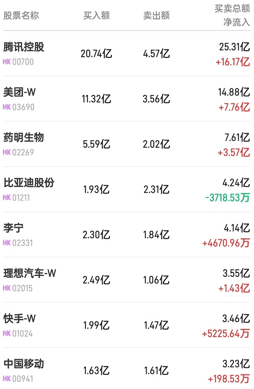 北水净买入最多的个股是腾讯(00700)、美团-W(03690)、药明生物(02269)。北水净卖出最多的个股是盈富基金(02828)、李宁(02331)、兖矿能源(01171)。