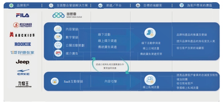 透过整合营销解决方案服务,公司可为客户提供线上线下营销解决方案服务,增强客户品牌及产品的认知度及人气。于往绩记录期间,逾200名客户委聘公司提供整合营销解决方案服务,在快消品、鞋服及的房产行业取得突出成就。公司客户品牌包括:鸿星尔克、ABCKids、韩后、立白、斐乐、金冠、361度、贵人鸟、盼盼、恒安、安井、华润置地及万科。根据弗若斯特沙利文报告,按2021年的收益计,全国十大运动品牌公司中有六家是公司客户。