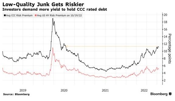 就连先锋集团也表示,它在B级公司债中所持比重过低,并敦促谨慎对待CCC评级的问题。相对于美国国债,投资者要求的风险CCC债券的平均收益率已上升至11.15个百分点,远高于通常与危机相关的10个百分点的门槛。根据彭博指数汇编的数据,这距离2020年年中以来的最高风险溢价仅一步之遥。