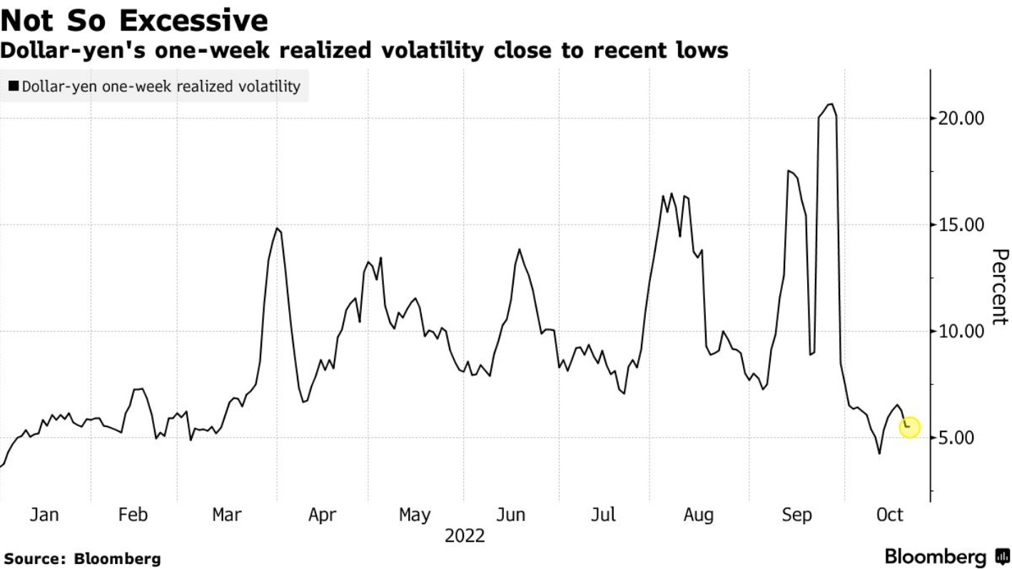 由下图可见,衡量日元当前价格波动幅度(一周已实现波动),与今年的低点相差不远。