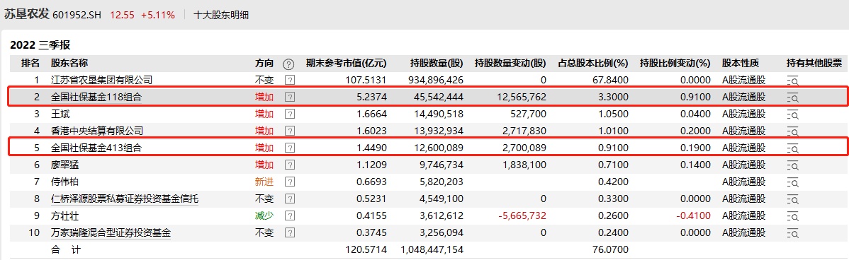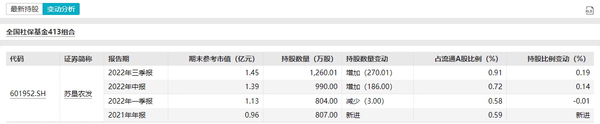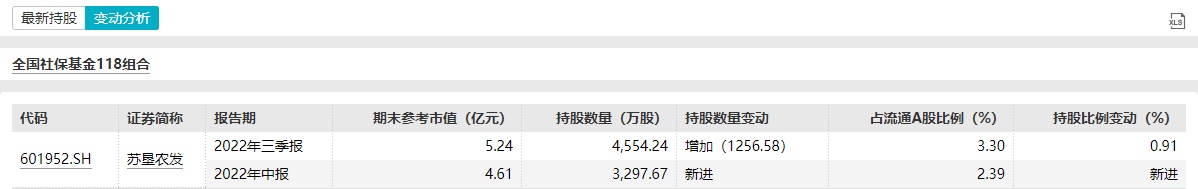 具体来看,社保基金118组合增持苏垦农发1256.58万股,持股数环比增加38.1%,增持后持股数为4554.24万股,期末参考市值为5.24亿元。118组合于今年二季度末首次新晋苏垦农发前十大股东,当时期末参考市值为5.24亿元。