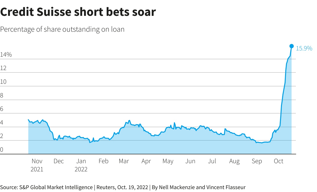 标普全球市场情报(S&P Global Market Intelligence)的数据显示,截至10月19日,瑞信股票的卖空比例为15.9%,在欧洲银行中处于最高水平之一。相比之下,该股的卖空比例在两周前仅为3%-4%区间。