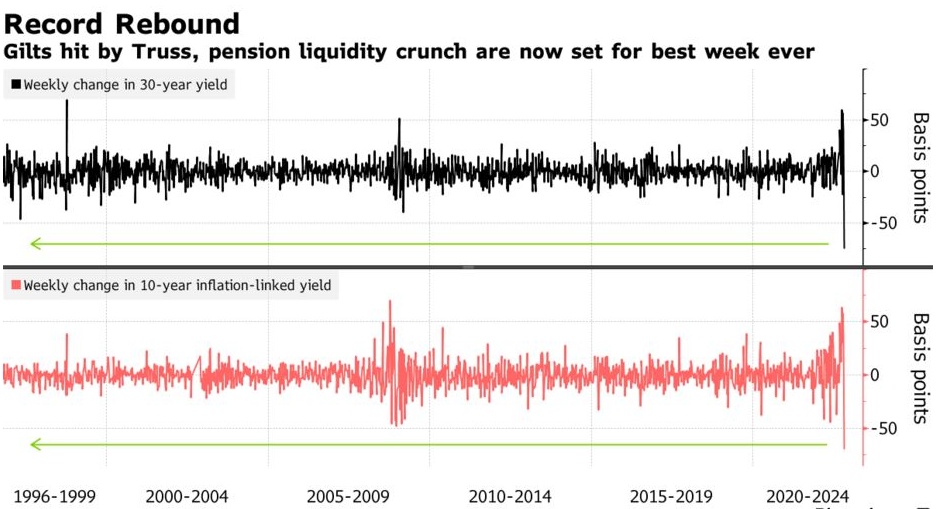 智通财经APP获悉,处于近期市场动荡中心的英国政府债券,将出现有记录以来最大的单周涨幅。30年期英国国债利率本周大跌78个基点,为数十年来最大跌幅。10年期和30年期通胀挂钩英国国债的收益率也将出现创纪录的下滑。英国30年期金边债券目前的收益率约为4%,接近9月底迷你预算公布前的水平。