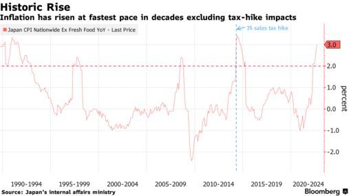 经济学家的预测表明,日本的物价增长速度至少与2014年销售税上调后的通胀上升速度一样快。尽管日本央行行长黑田东彦承诺将持续实施宽松政策,但他也表示有必要关注成本推动型通胀对消费者支出的影响。