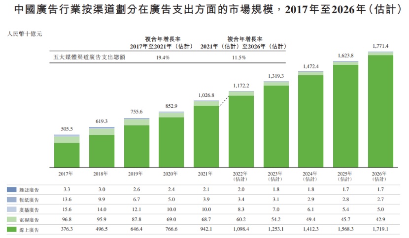 而在互联网及移动技术的不断创新、消费者在数字设备上花费的时间增加以及在线广告的数据驱动潜力的驱动下,国内广告行业逐渐将其广告开支由线下渠道转移至在线渠道,以触及更广泛但目标更明确的受众范围,并以具成本效益的方式提供更多定制化的广告信息。