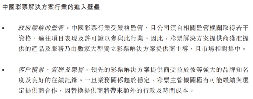 值得一提的是,彩票业务服务存在一定的准入门槛。润歌互动在其招股书中提到,彩票业务存在严格的政府监管,因此行业准入需要过往项目表现和政府许可;另外,与彩票主管机构的供应商合作也存在一定行政和时间成本,因此市场相对集中且市场份额相对稳定。