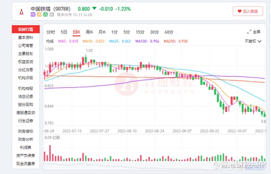 在诸多大行下调目标价后,中国铁塔二级市场股价表现并不佳,绩后股价持续走低,创下4月份以来的新低,截至10月21日收盘,公司股价跌1.23%,收0.80港元/股。