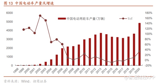 我国电动自行车行业发展主要经历四个阶段:孕育阶段、成长阶段、高速发展阶段、规范发展阶段。1995年,清华大学实验室研制了第一辆轻型电动车,自此我国电动自行车开始从实验室走向市场。孕育阶段市场增长速度缓慢,技术相对落后,缺乏相关政策指导,2000年全国电动两轮车产量仅29万辆。成长阶段受国内政策以及特殊事件驱动,行业实现初步成长。2001年后“禁摩令”政策在全国落地,电动两轮车作为摩托车的替代品迅速消化了政策带来的市场需求。2003年“非典”爆发,人们为减少密切接触改变了以往的公共出行方式,电动两轮车需求因此得以快速增长,2005年中国电动两轮车产量达1211万辆。随着电动车生产技术与供应链的日益完善,电动两轮车行业进入高速发展的黄金期,2013年我国电动两轮车产量达3695万辆。2013年以后,我国电动两轮车行业逐渐稳定,增速有所放缓。随着2019年“新国标”的出台,行业迎来出清洗牌。一方面,技术标准不合格的中小企业逐渐被淘汰;另一方面,“新国标”带来的替换需求有望驱动行业新一轮增长,2020年全国电动两轮车产量达4834万辆,同比增长33.94%。