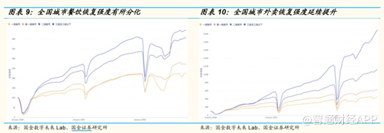短期来看,随着国内疫情得到控制,国金数字未来Lab数据显示,10月2日至10月8日,反映全国各城市餐饮商家活跃数目的餐饮恢复强度有所分化,一线、新一线、三线及以下城市餐饮恢复强度分别较前周回落0.06%、0.88%、0.34%,二线城市较前周回升0.28%。反映全国各城市活跃外卖骑手数目的城市外卖恢复强度普遍提升,一线、新一线、二线、三线及以下城市外卖恢复强度分别较前周提升1.1%、1.2%、0.8%、1.2%。