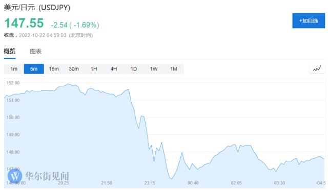 周五,日元兑美元一度最高触及1美元兑151.94日元。而至当天收盘时,日元兑美元短线拉升,最终报147.55。
