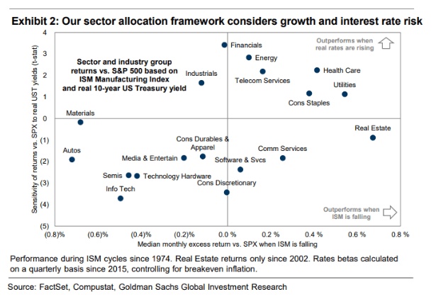 “我们分析了自1974年ISM制造业指数下跌以来,每个行业与标普500指数的月超额回报率中值。我们将每个板块相对于标普500指数的季度超额回报率分离出来,发现其对10年期美国国债实际收益率变化的敏感性,并控制了盈亏以平衡通胀。”