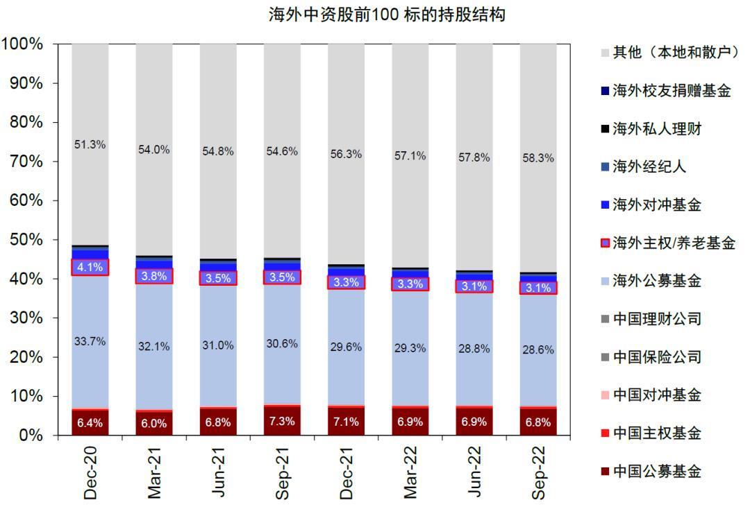 图表:外资持股近期有所回落,主权基金和养老金占海外中资股持股的较小部分