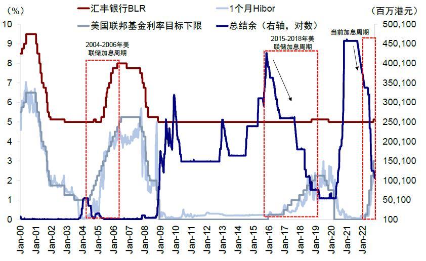 图表:美国加息周期推动资金流出中国香港及其他新兴市场,中国香港银行总结余明显下滑