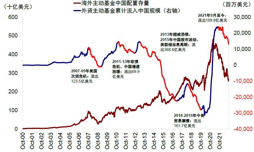 对比历史看,此轮资金流出规模有多大?绝对规模不及2018-2019年。EPFR数据显示,2000年以来,中国市场经历了4轮海外主动型基金的流出阶段,分别为:1)2007-2009年金融危机(流出123.5亿美元)、2)2011-2013年欧债危机(69.9亿美元)、3)2013-2017年美联储紧缩和中国股市波动(368.6亿美元),以及4)2018-2019年贸易摩擦(161.7亿美元)。本轮自2021年8月高点以来海外主动基金累计流出109.8亿美元,无论规模还是持续时间都弱于2018-2019年或2013-2017年。同时,在控制股价对资金流的影响下,我们测算流出规模不及2020-2021年期间流入规模的一半。