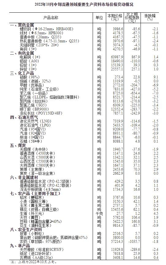智通财经APP获悉,10月24日,国家统计局发布2022年10月中旬流通领域重要生产资料市场价格变动情况。据对全国流通领域9大类50种重要生产资料市场价格的监测显示,2022年10月中旬与10月上旬相比,23种产品价格上涨,24种下降,3种持平。