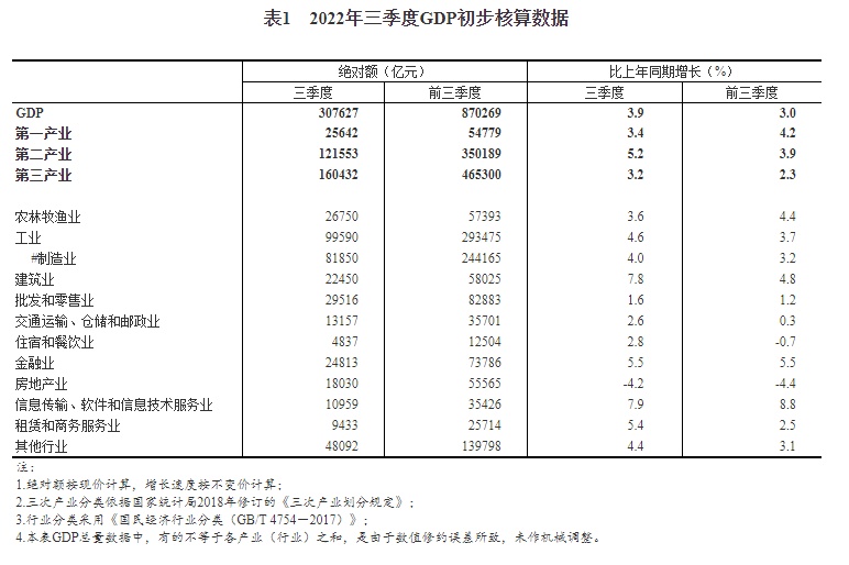 根据有关基础资料和国内生产总值(GDP)核算方法,经初步核算,我国2022年三季度GDP核算结果如下。
