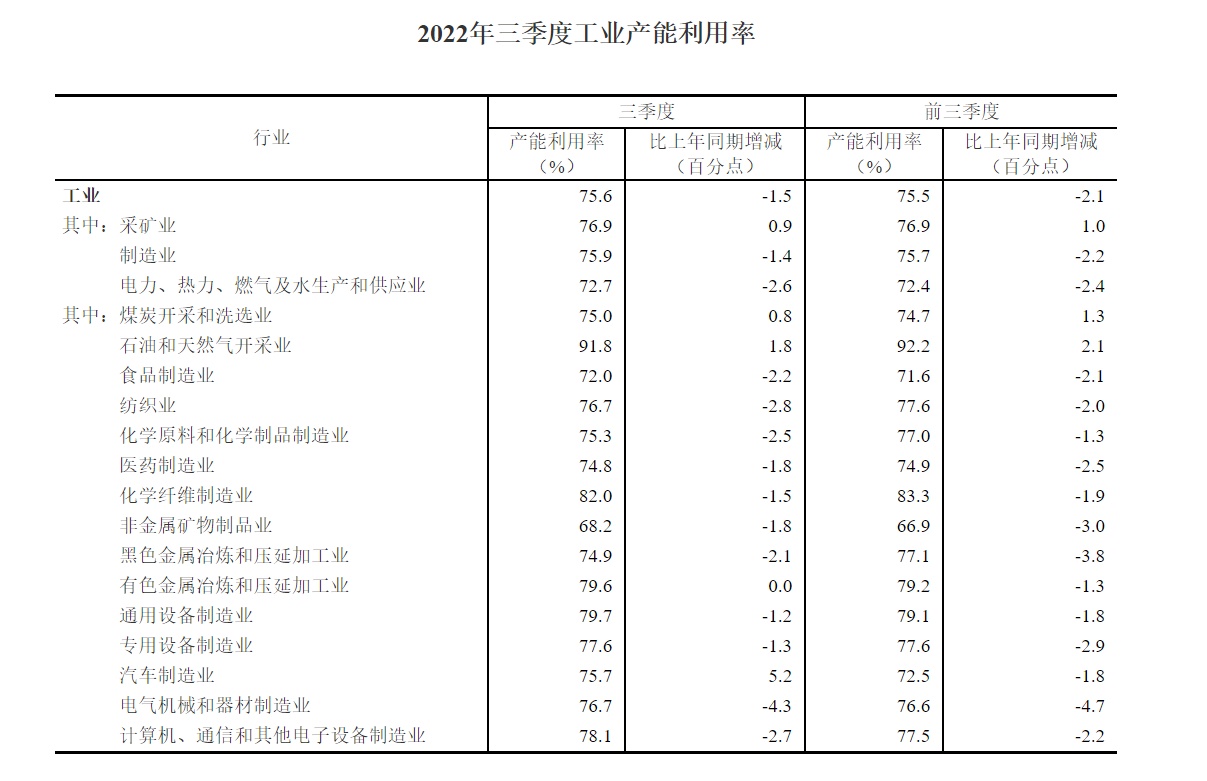 分主要行业看,三季度,煤炭开采和洗选业产能利用率为75.0%,食品制造业为72.0%,纺织业为76.7%,化学原料和化学制品制造业为75.3%,非金属矿物制品业为68.2%,黑色金属冶炼和压延加工业为74.9%,有色金属冶炼和压延加工业为79.6%,通用设备制造业为79.7%,专用设备制造业为77.6%,汽车制造业为75.7%,电气机械和器材制造业为76.7%,计算机、通信和其他电子设备制造业为78.1%。