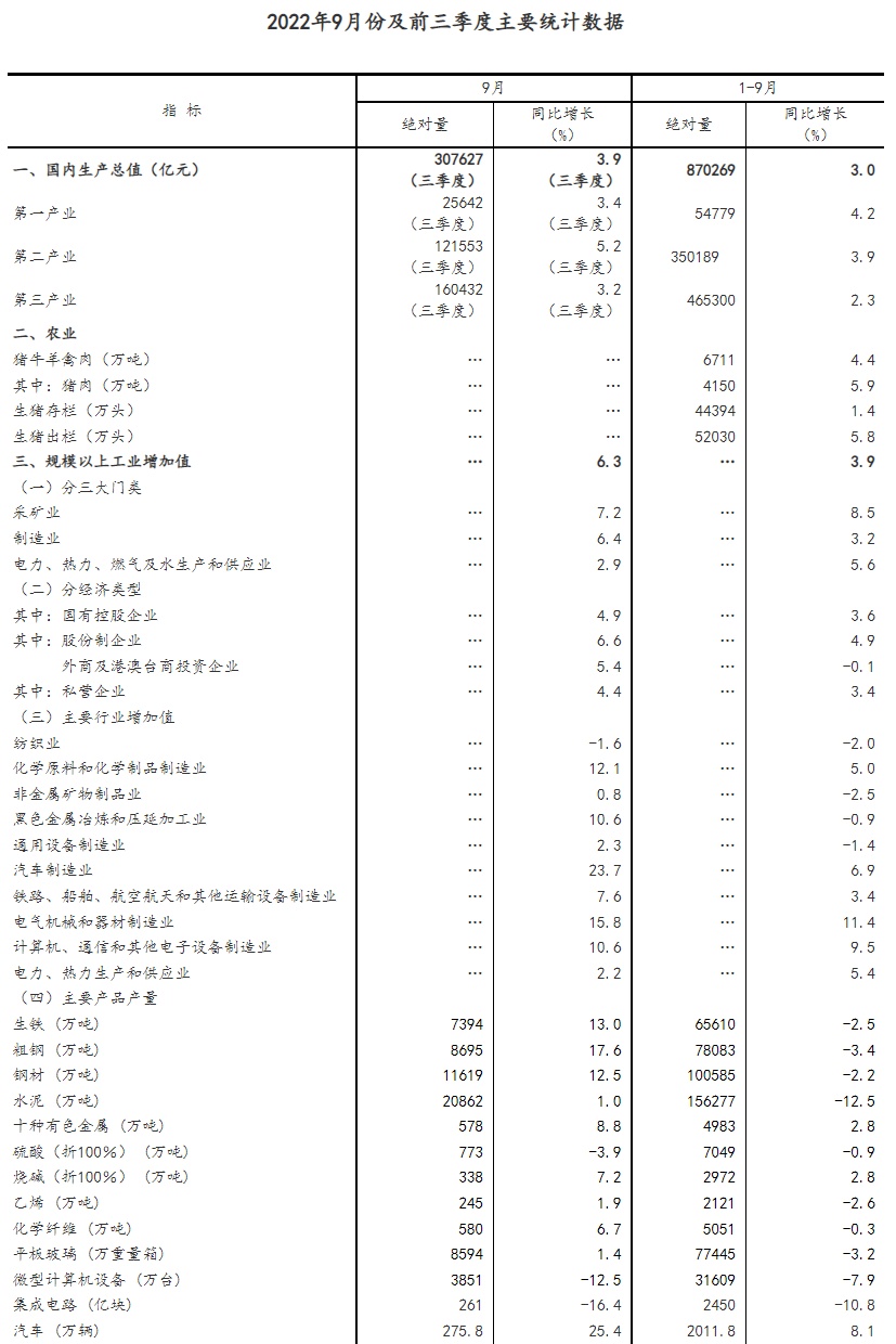 智通财经APP获悉,10月24日,经国家统计局初步核算,前三季度国内生产总值870269亿元,按不变价格计算,同比增长3.0%,比上半年加快0.5个百分点。从环比看,三季度国内生产总值增长3.9%。国民经济顶住压力持续恢复,三季度经济恢复向好,明显好于二季度,生产需求持续改善,就业物价总体稳定,民生保障有力有效,总体运行在合理区间。
