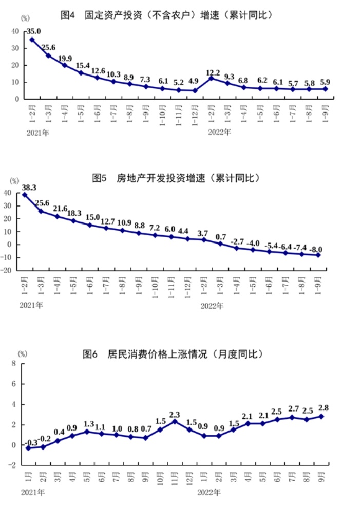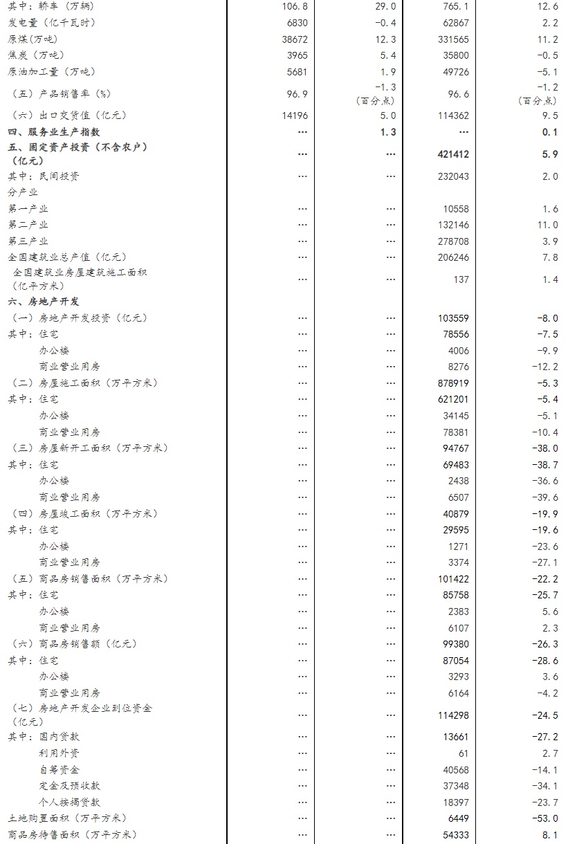 前三季度,全国固定资产投资(不含农户)421412亿元,同比增长5.9%。分领域看,基础设施投资同比增长8.6%,制造业投资增长10.1%,房地产开发投资下降8.0%。分产业看,第一产业投资同比增长1.6%,第二产业投资增长11.0%,第三产业投资增长3.9%。民间投资增长2.0%。高技术产业投资增长20.2%,其中高技术制造业和高技术服务业投资分别增长23.4%、13.4%。高技术制造业中,电子及通信设备制造业、医疗仪器设备及仪器仪表制造业投资分别增长28.8%、26.5%;高技术服务业中,科技成果转化服务业、研发设计服务业投资分别增长22.1%、18.7%。社会领域投资增长13.2%,其中卫生、教育投资分别增长31.2%、8.1%。全国商品房销售面积101422万平方米,同比下降22.2%;商品房销售额99380亿元,下降26.3%。三季度,固定资产投资同比增长5.7%,比二季度加快1.5个百分点;9月份固定资产投资环比增长0.53%。
