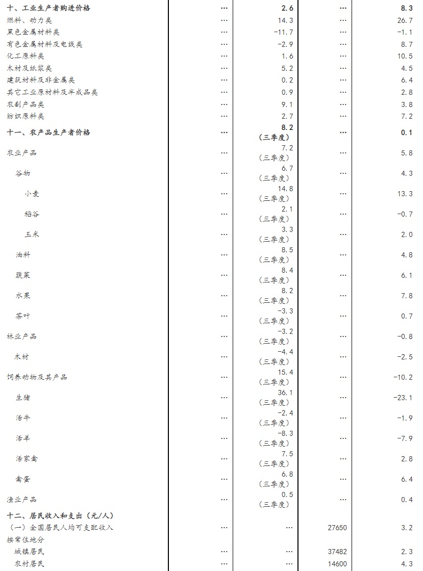 前三季度,农业(种植业)增加值同比增长3.8%。全国夏粮早稻产量合计17553万吨,比上年增加155万吨,增长0.9%。秋粮播种面积稳中有增,秋粮生产有望丰收。前三季度,猪牛羊禽肉产量6711万吨,同比增长4.4%,其中猪肉、牛肉、禽肉、羊肉产量分别增长5.9%、3.6%、1.7%、1.5%;牛奶产量增长7.7%,禽蛋产量增长2.7%。三季度末,生猪存栏44394万头,同比增长1.4%,其中能繁殖母猪存栏4362万头;生猪出栏52030万头,同比增长5.8%。